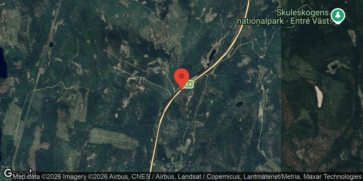 Ett fordonshaveri har inträffat på E4 i höjd med Skuleberget, vilket har lett till stillastående personbilar i både norr- och södergående riktning. Händelsen rapporterades första gången klockan 21:14 den 5 april 2026.